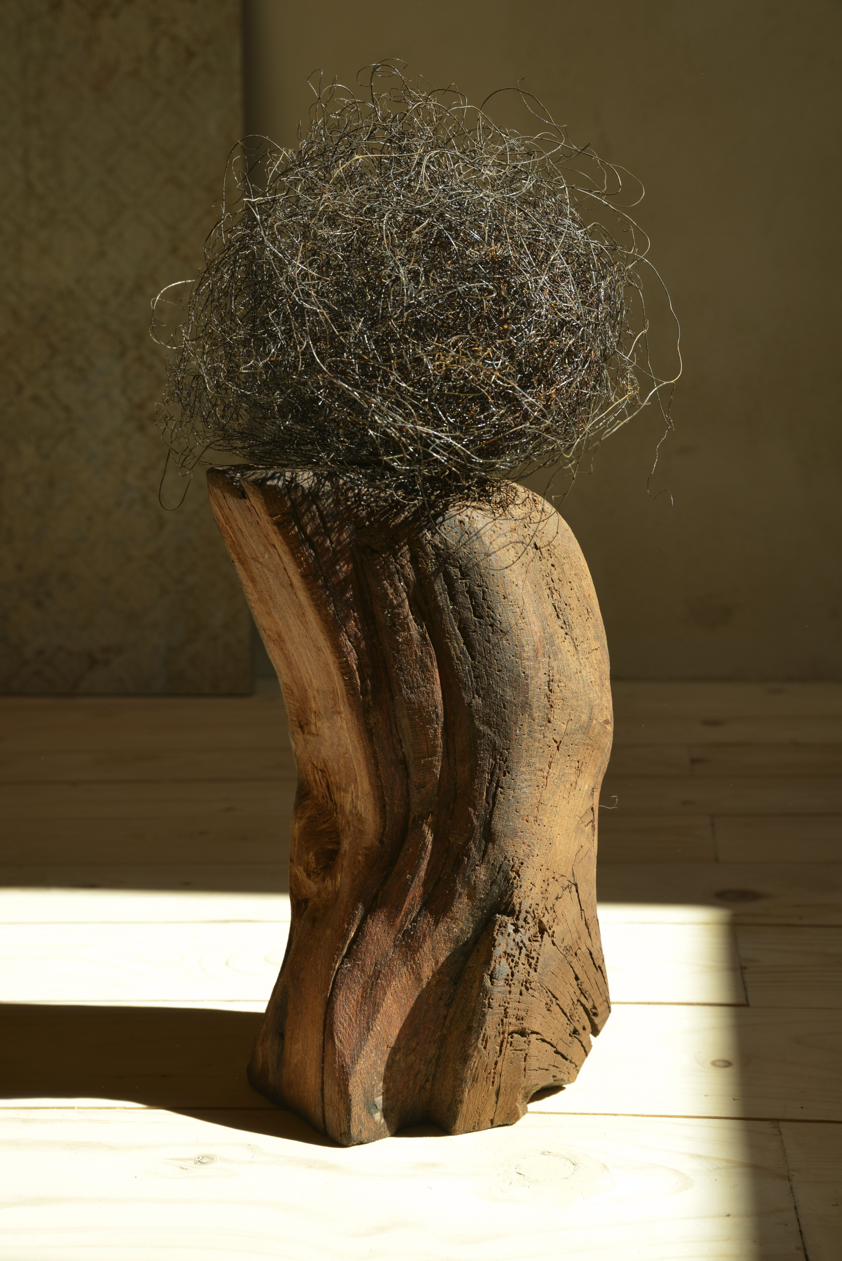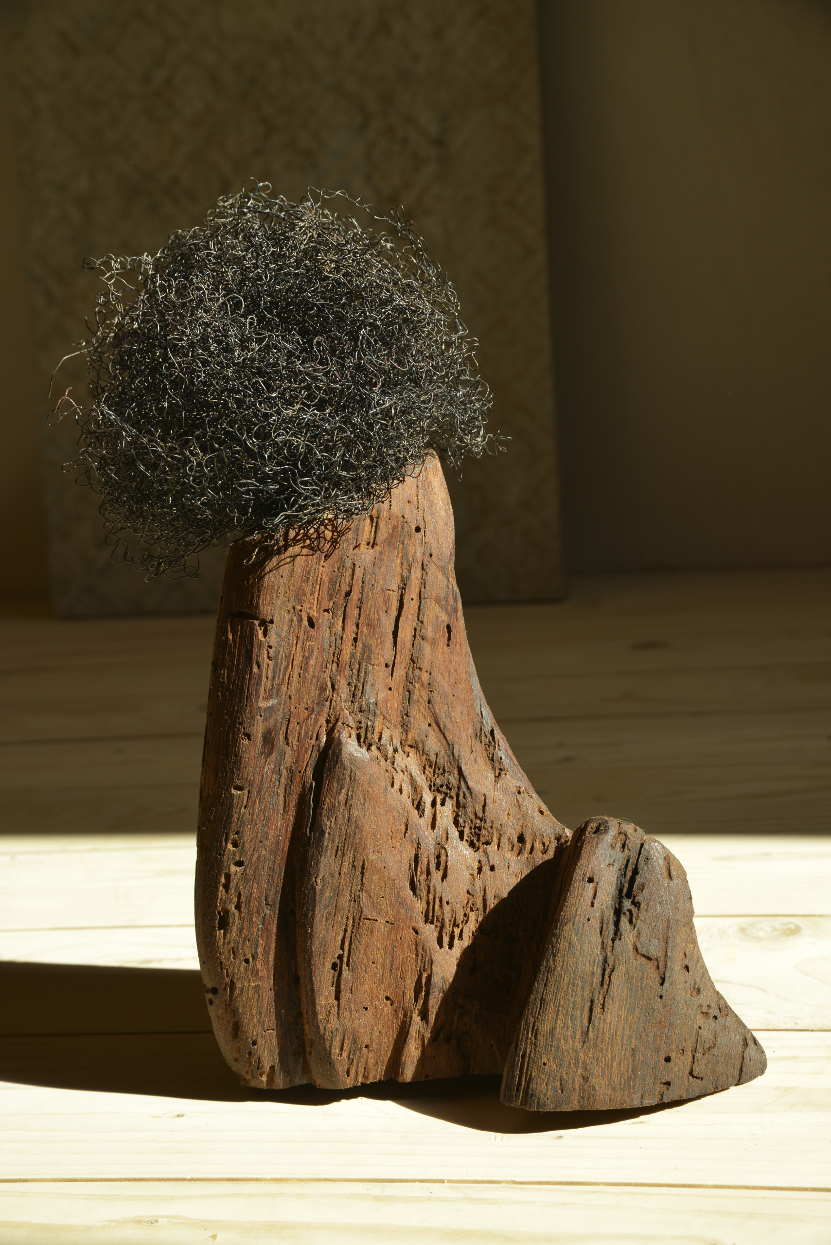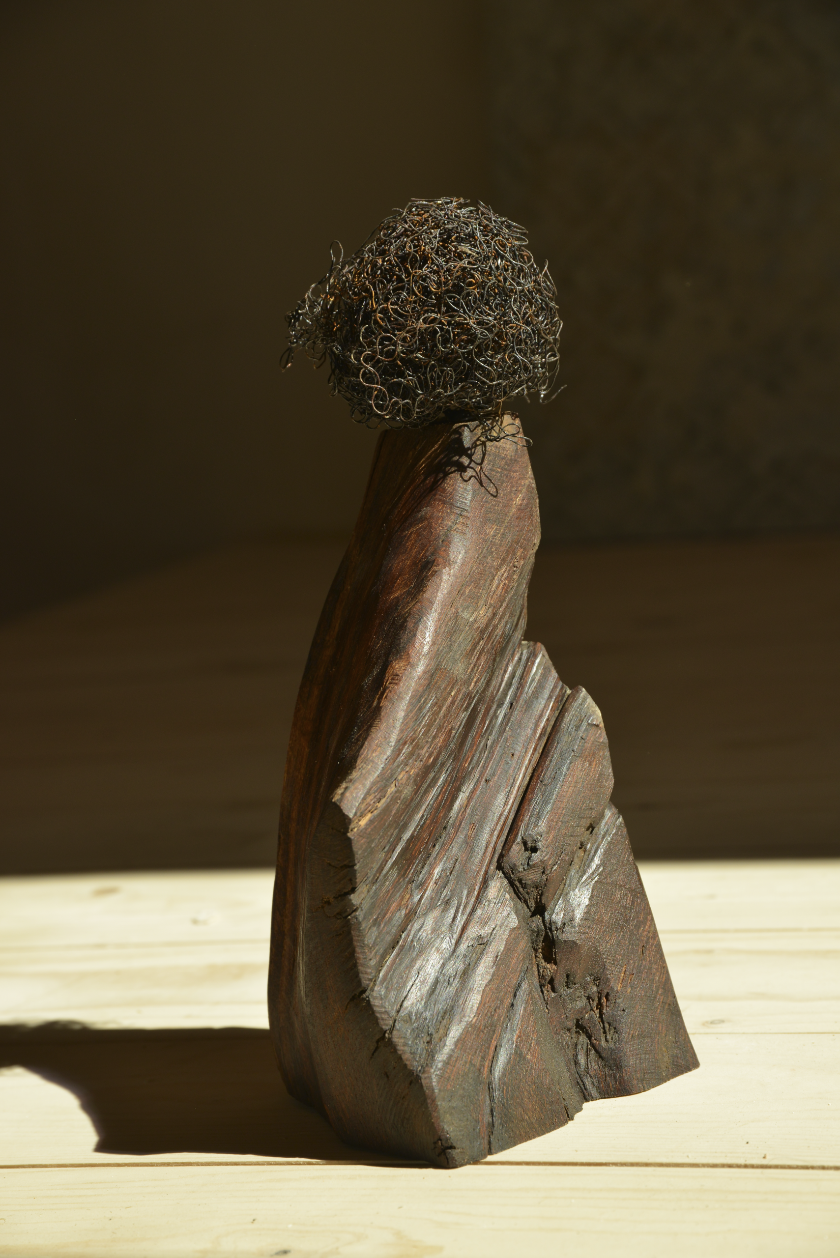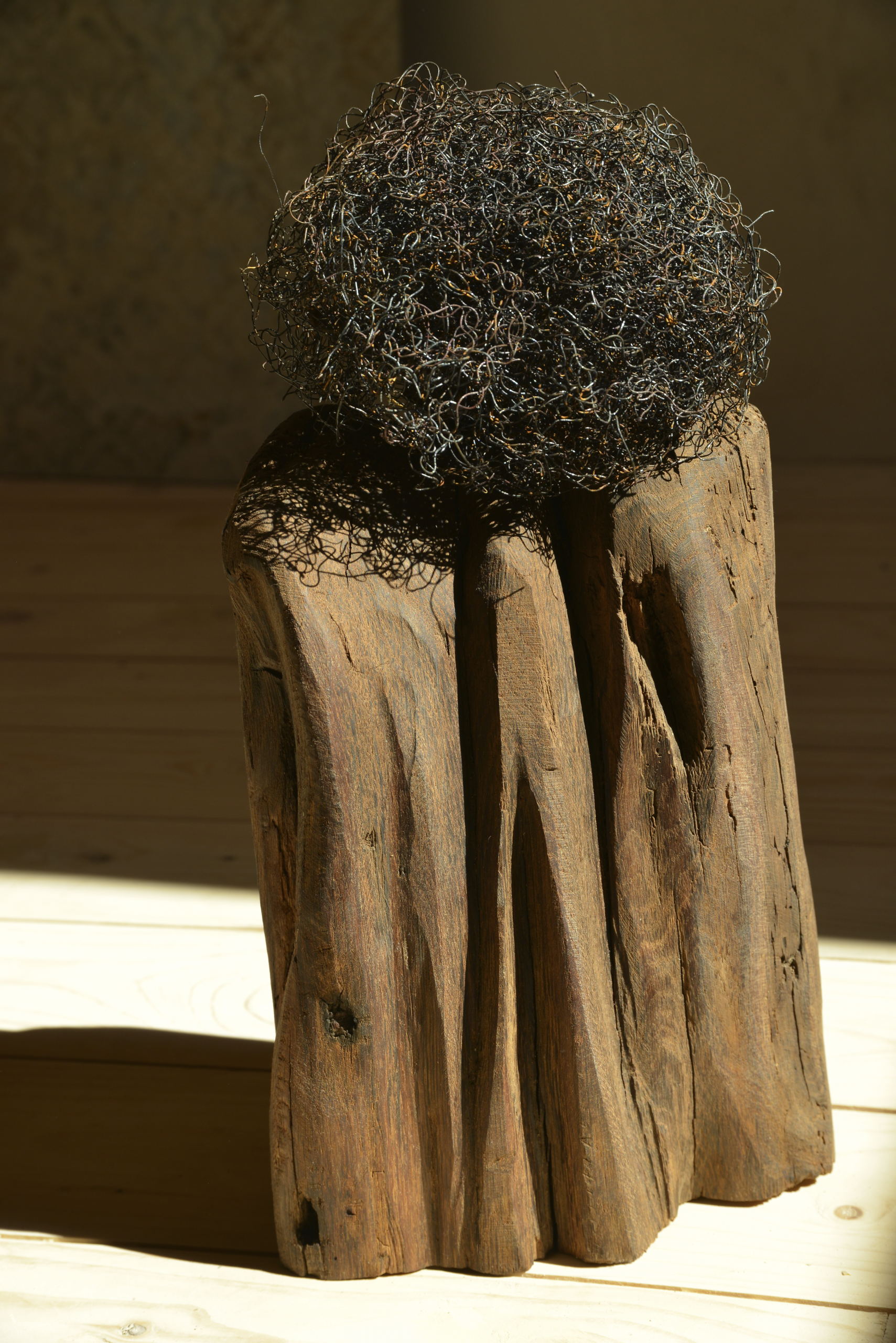 Der Draht hielt ursprünglich Strohmatten des Zaunes eines Bauernhauses neu gewonnener Freunde im Dorf zusammen. Den Draht habe ich nach dem Verbrennen der Matten geformt und brüniert. Das Eichenholz ist verworfenes Bauholz und stammt aus meiner 200jahre alten Scheune. Es wurde gesägt, gebeilt, geschliffen, zur Reinigung 40 Minuten 70 Grad erhitzt, anschließend geölt