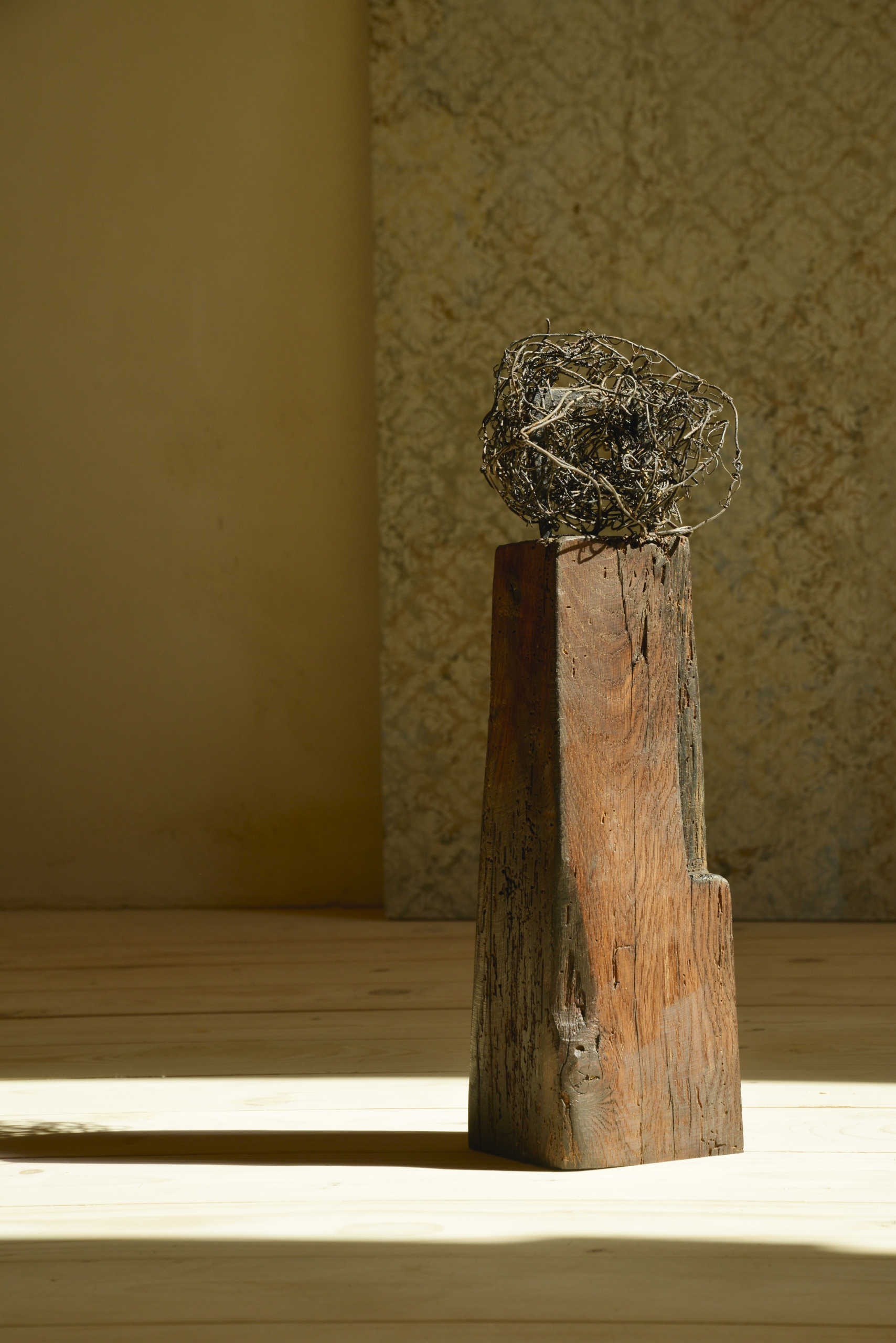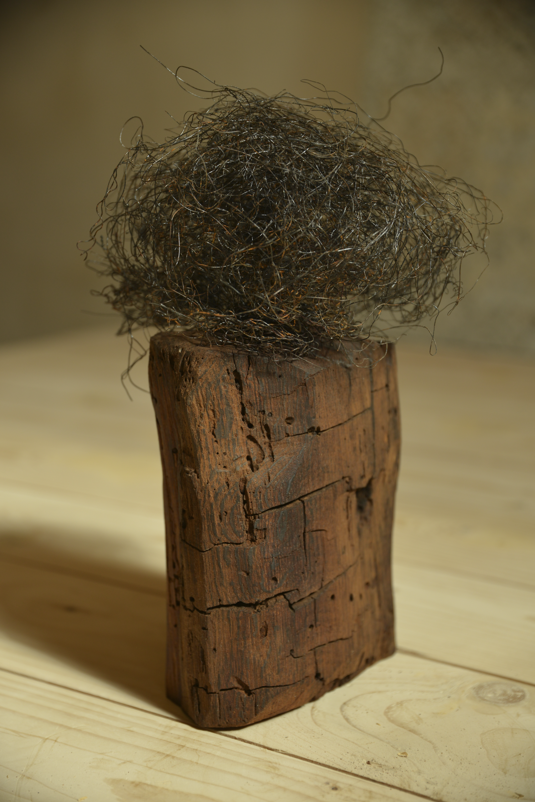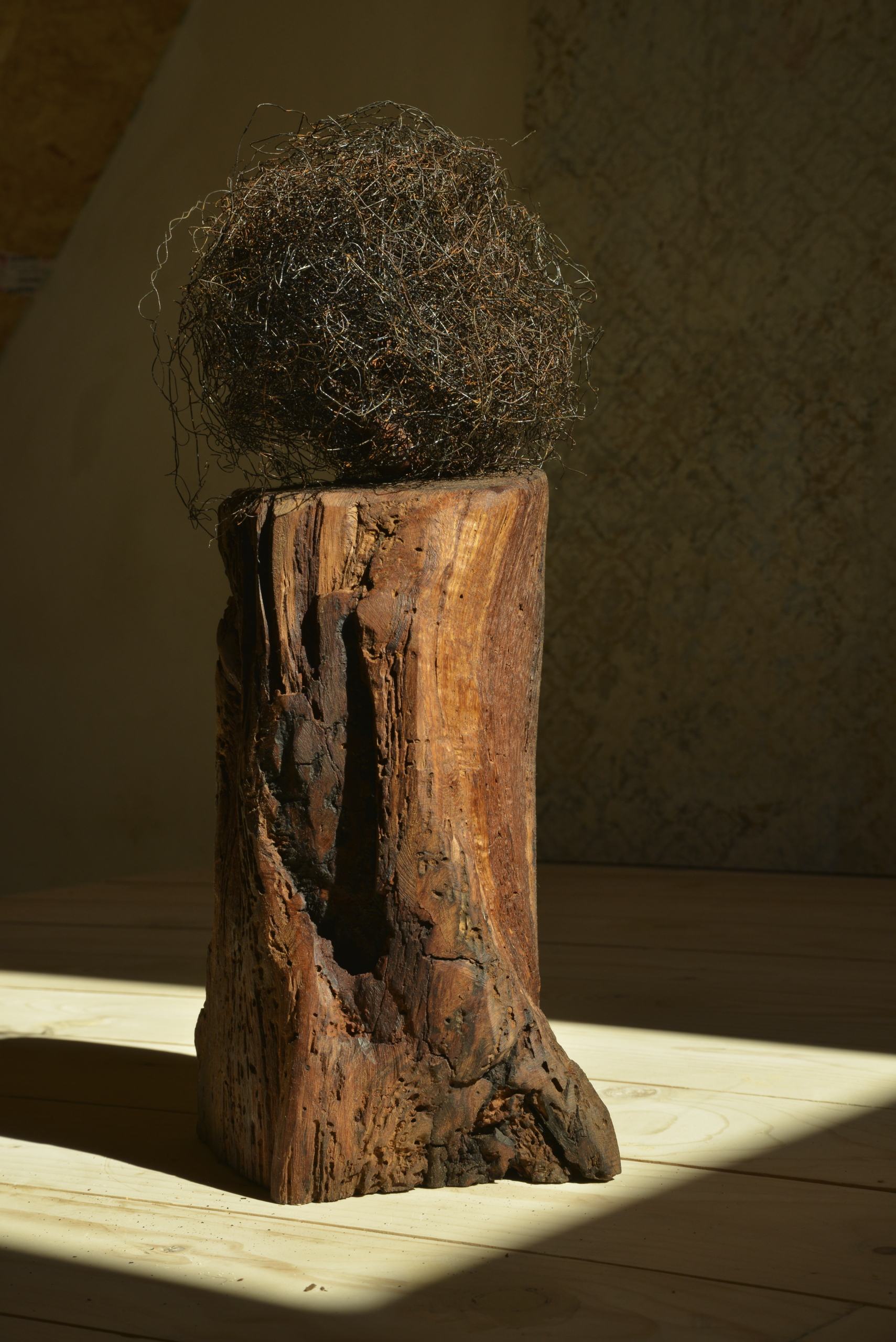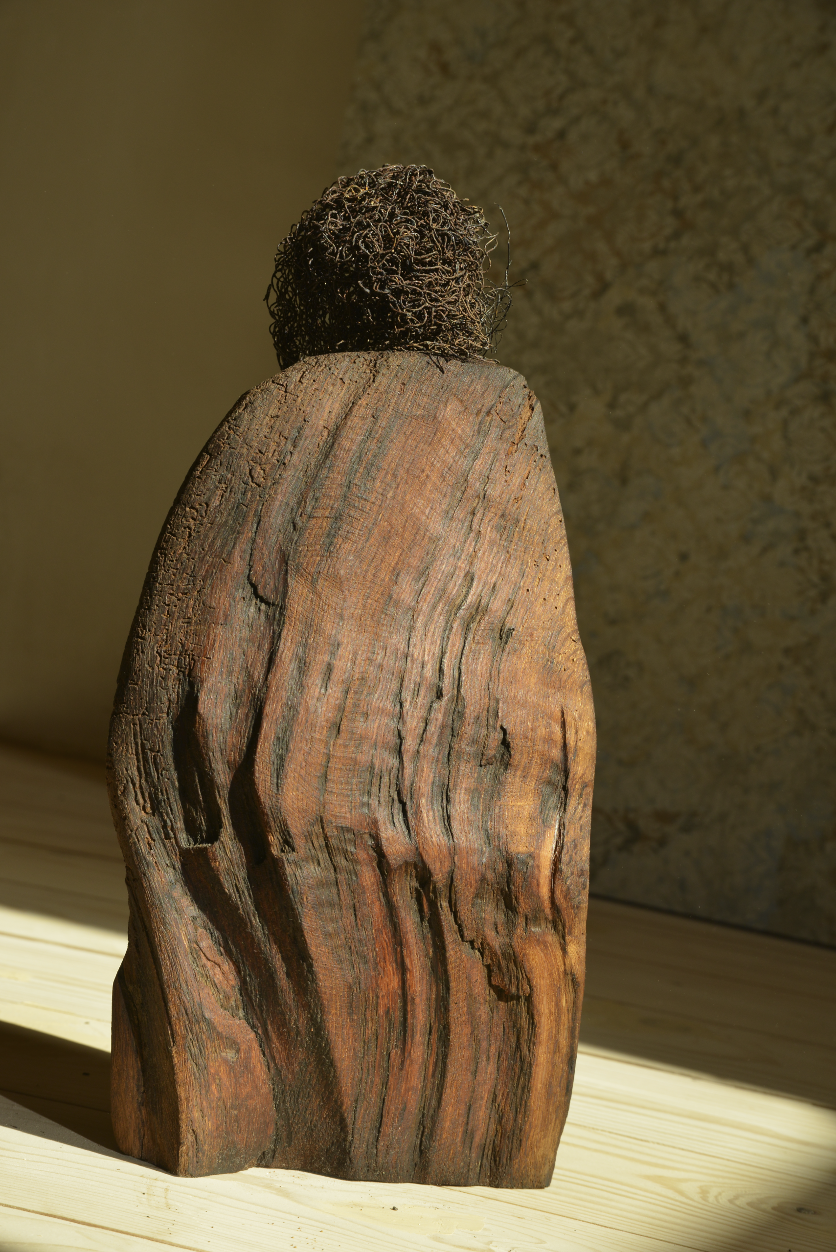 Der Draht hielt ursprünglich Strohmatten des Zaunes eines Bauernhauses neu gewonnener Freunde im Dorf zusammen. Den Draht habe ich nach dem Verbrennen der Matten geformt und brüniert. Das Eichenholz ist verworfenes Bauholz und stammt aus meiner 200jahre alten Scheune. Es wurde gesägt, gebeilt, geschliffen, zur Reinigung 40 Minuten 70 Grad erhitzt, anschließend geölt