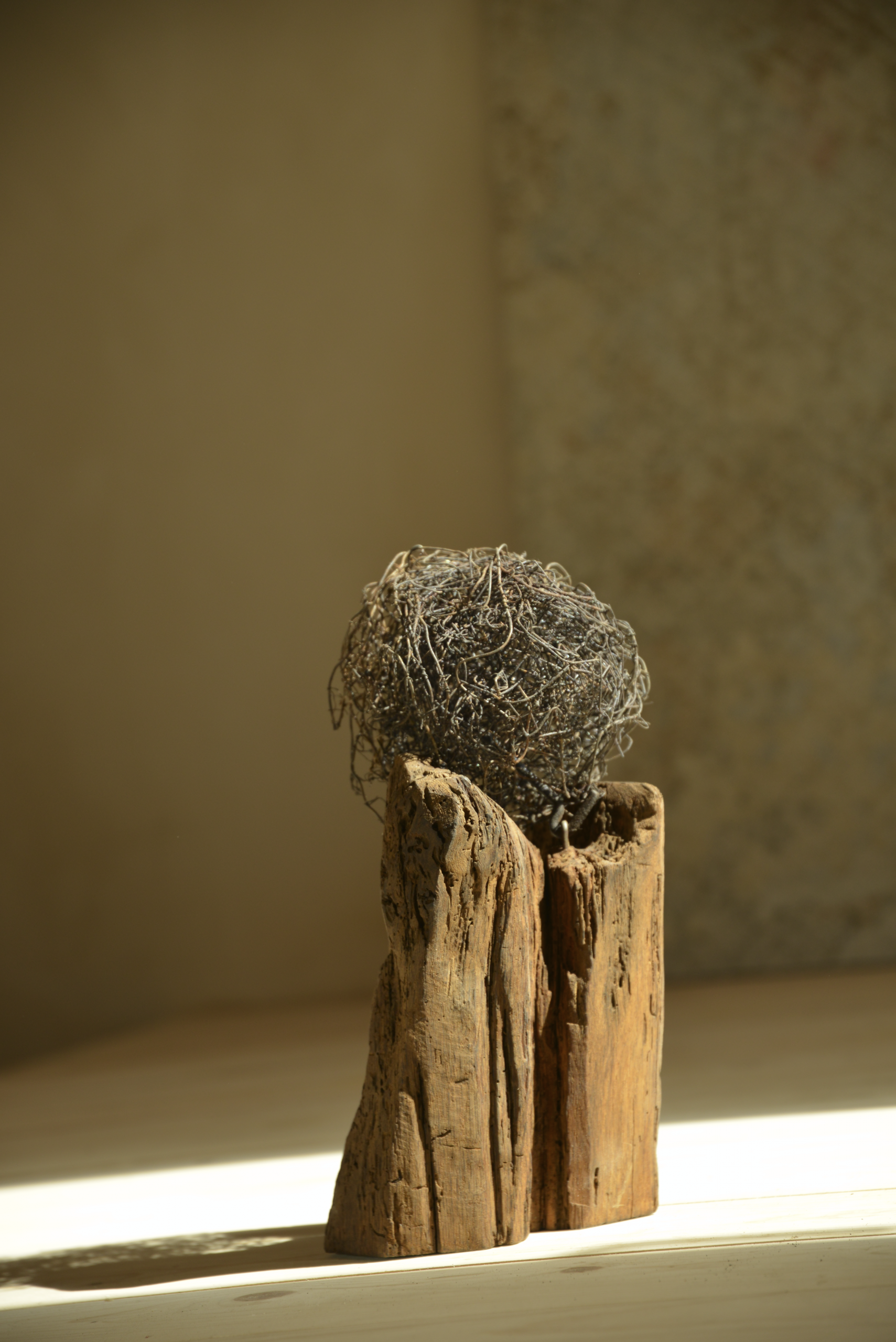 Objekte aus Eichenholz und brüniertem Metalldrahtgeflecht